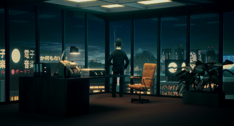 Akio standing in his office, overviewing his territory.